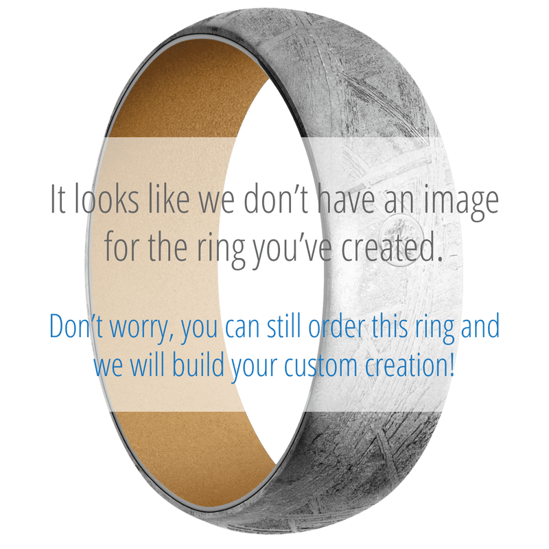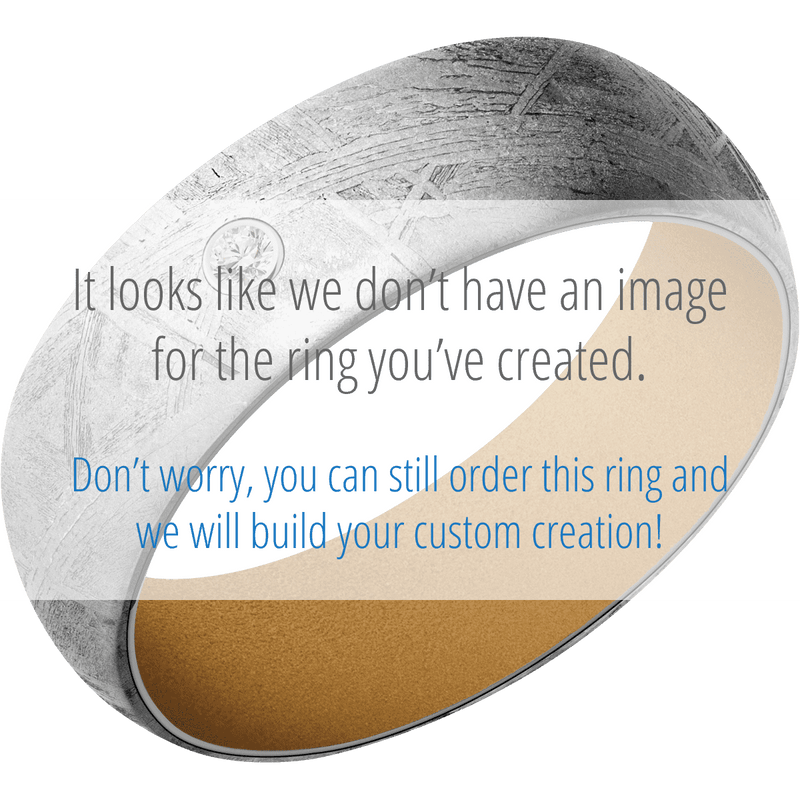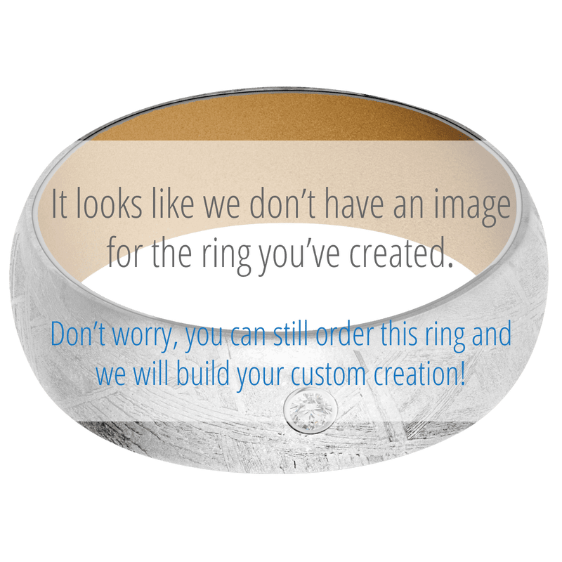 7 mm wide/Domed/Meteorite band with an arrangement of 1, .03 carat Round Lab Grown Diamond (ST) stones in a Bezel setting and featuring two 1 mm Side inlays of Blue Tiger Eye also featuring a Gold sleeve
