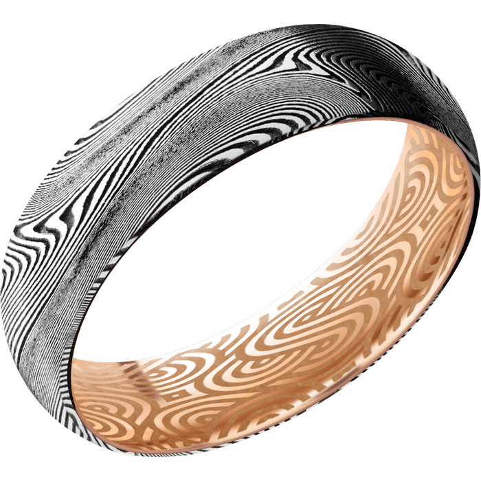 6mm wide Domed Tightweave Damascus Steel Ring with Tumble Kuro Damascus Finish / 14k Rose Gold Sleeve / None Interior Pattern