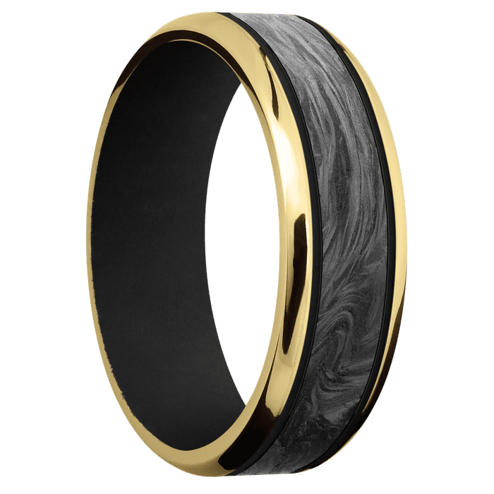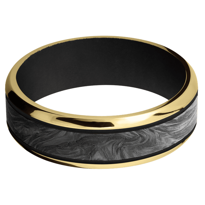 7mm wide Beveled 18k Yellow Gold Ring with Polish Finish / One 4mm Centered Forged Carbon Fiber Inlay and Black Cerakote Accents / Black Cerakote Sleeve