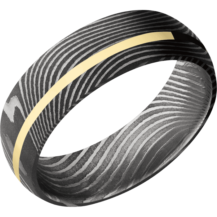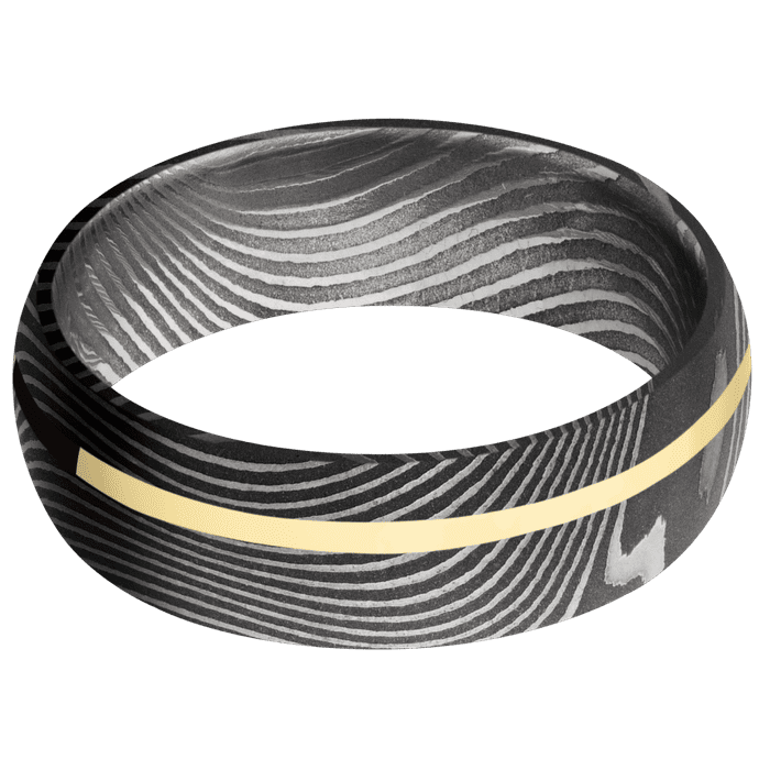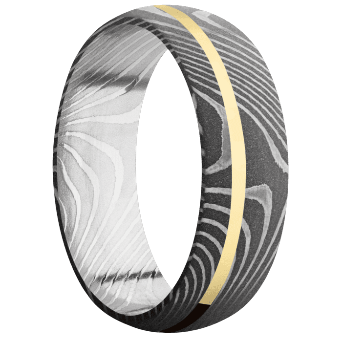 7mm wide Domed Flattwist Damascus Steel Ring with Acid Damascus Finish / One 1mm Off Center 14k Yellow Gold Inlay with Polish Finish