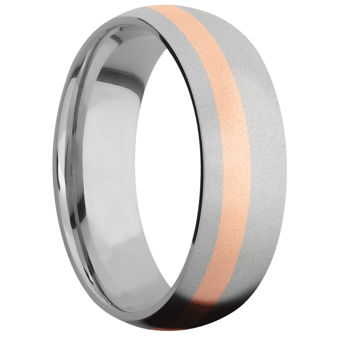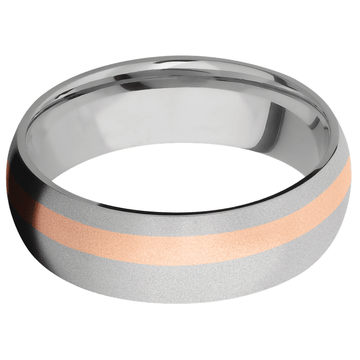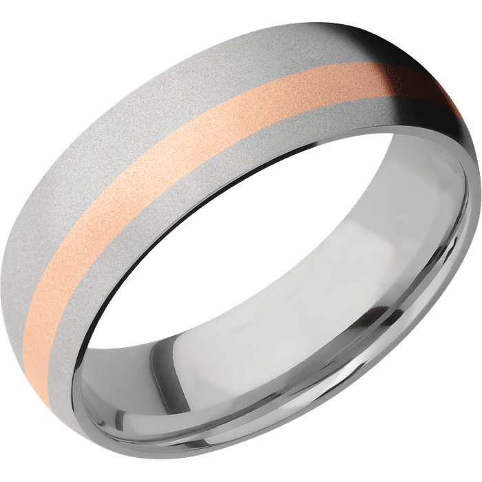 7mm wide Domed Titanium Ring with Bead Blast Finish / One 2mm Off Center 14k Rose Gold Inlay with Bead Blast Finish