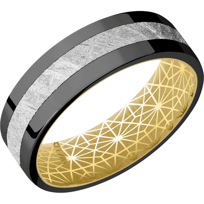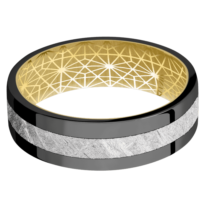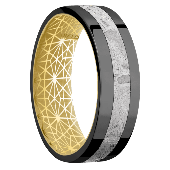 7mm wide Flat Black Titanium Ring with Polish Finish / One 3mm Centered Meteorite Inlay / 18k Yellow Gold Sleeve / None Interior Pattern