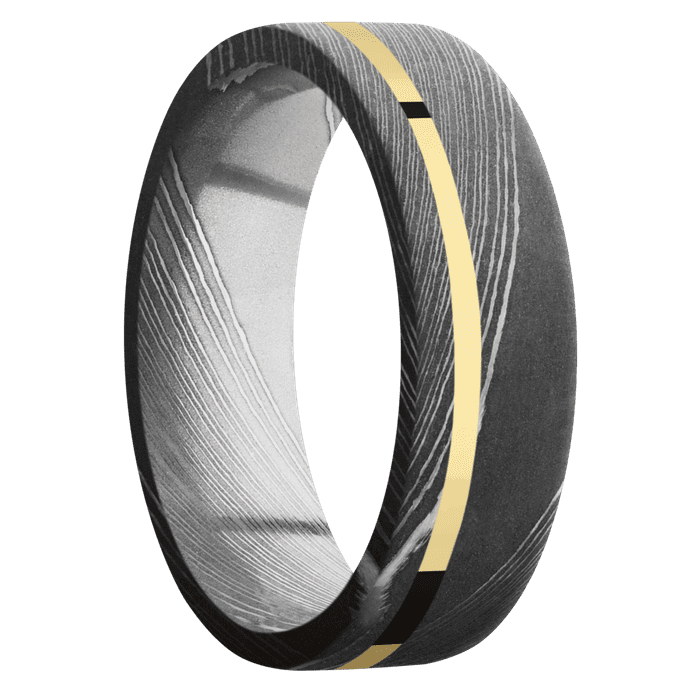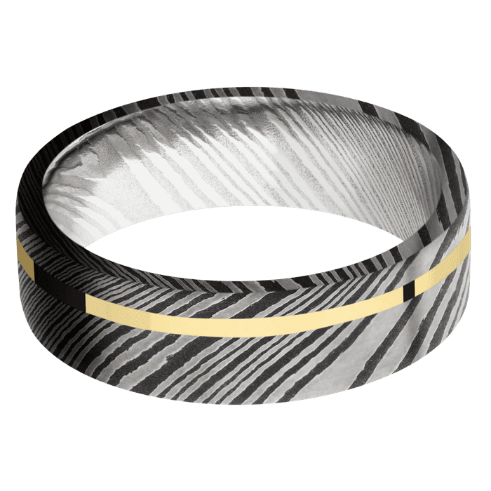 7mm wide Flat Damascus Steel Ring with Acid Damascus Finish / One 1mm Off Center 14k Yellow Gold Inlay with Polish Finish