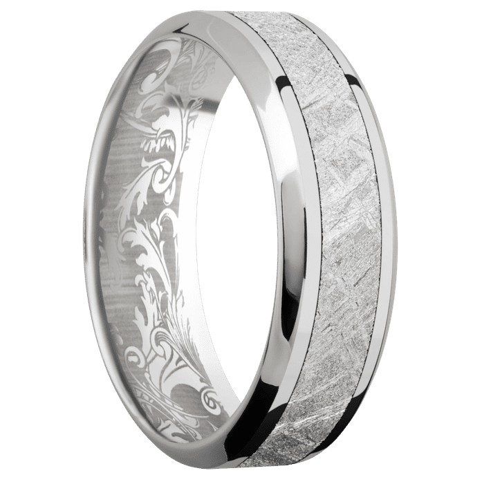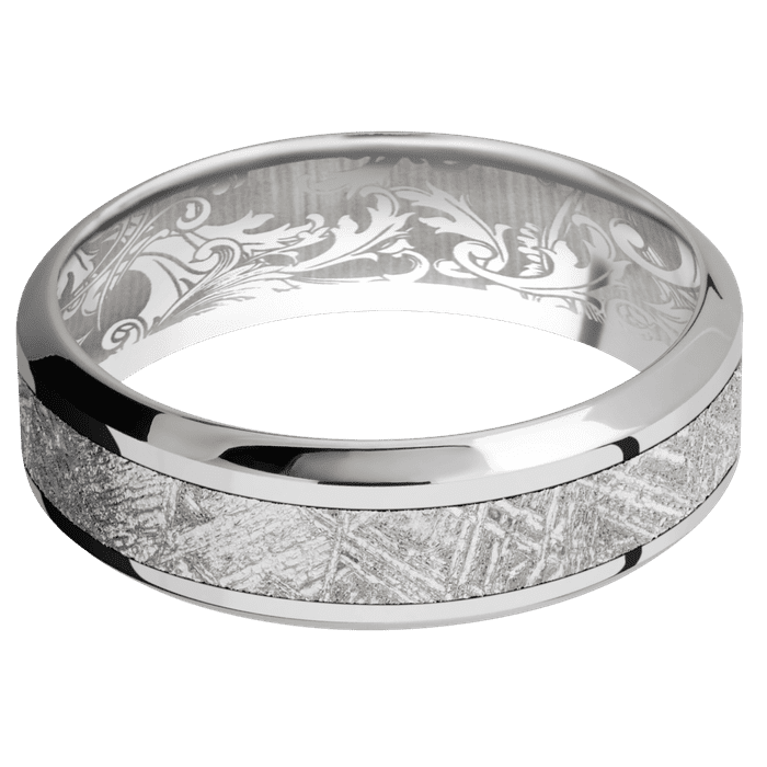 7mm wide High Bevel 18k White Gold Ring with Polish Finish / One 3mm Centered Meteorite Inlay / None Interior Pattern