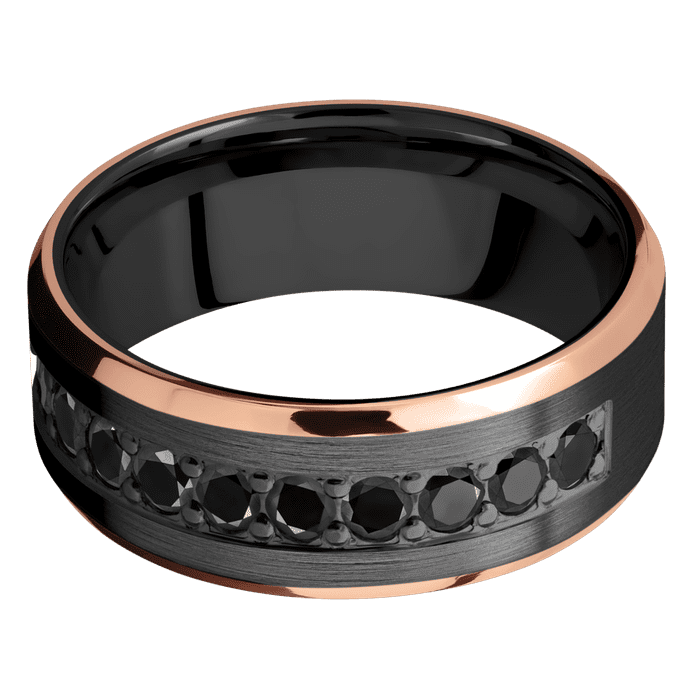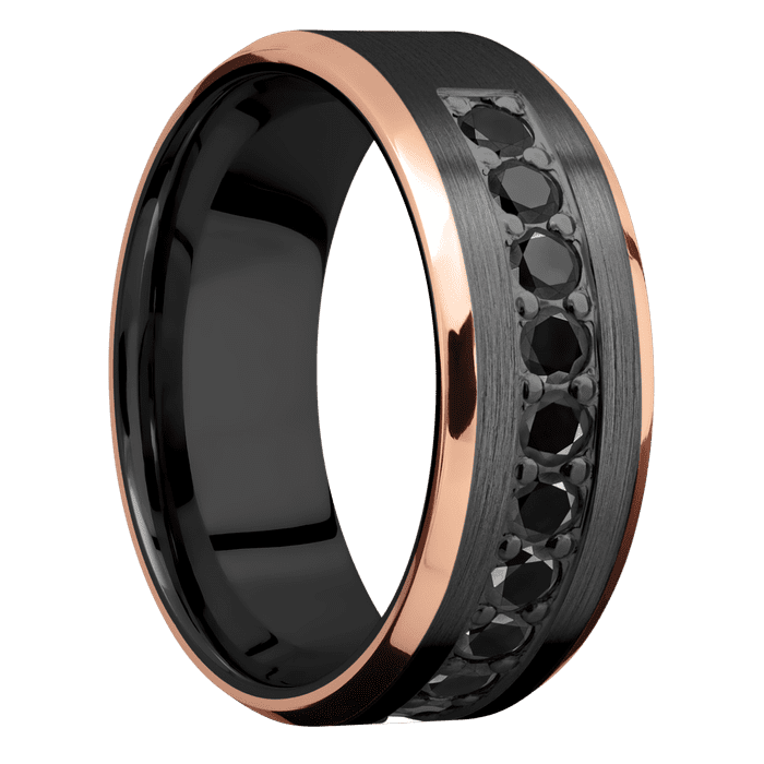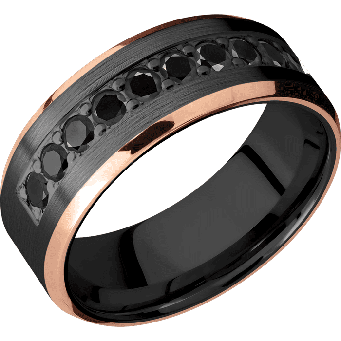 8mm wide Beveled Black Zirconium Ring with Satin Finish / Two 1mm Edge 14k Rose Gold Inlay with Polish Finish / Half Eternity Round .07 carat Black Diamond Bead-Set Gemstones