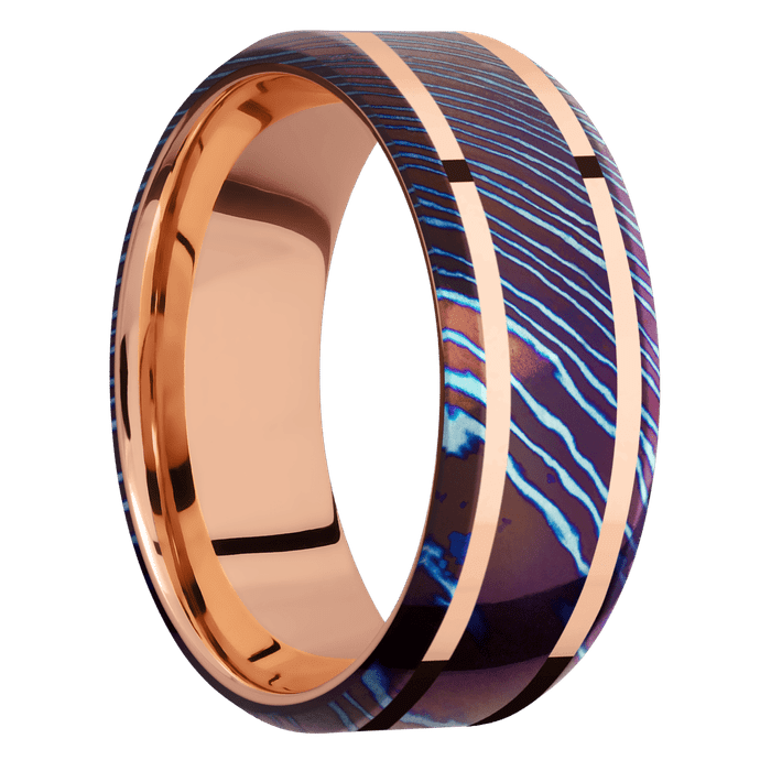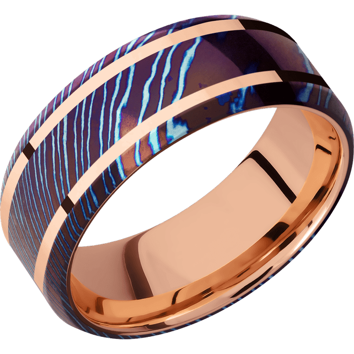 8mm wide Beveled Kuro-Ti Ring with Polish Kuro-Ti Finish / Two 1mm Wide 14k Rose Gold Inlay with Polish Finish / 14k Rose Gold Sleeve