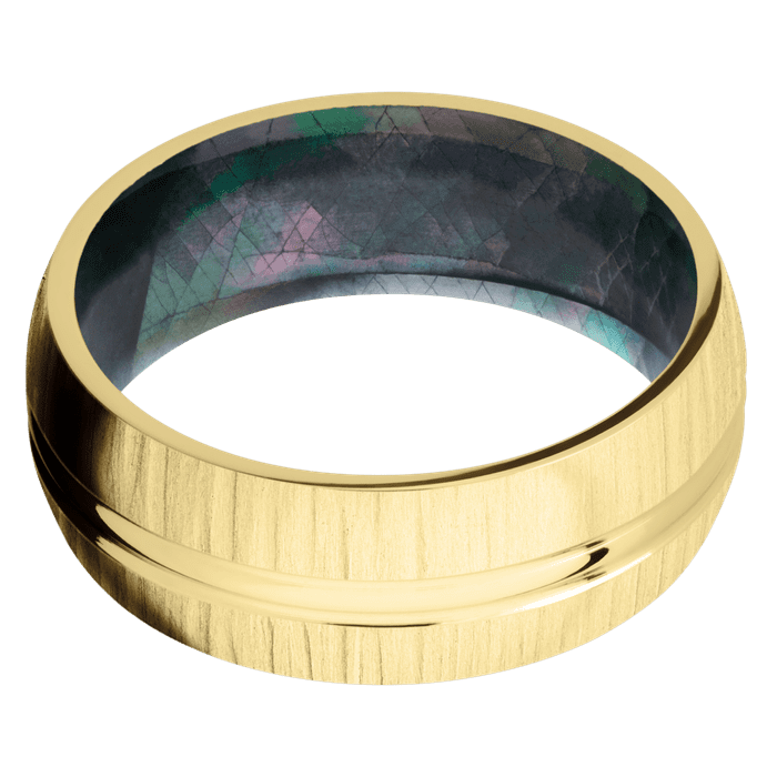 8mm wide Domed Center Round 14k Yellow Gold Ring with Treebark 1 Finish / Black Mother of Pearl Sleeve