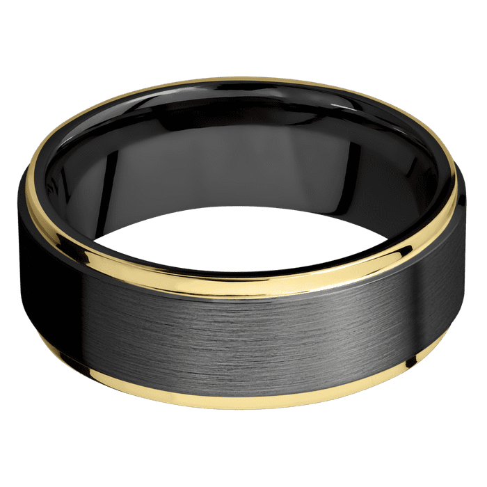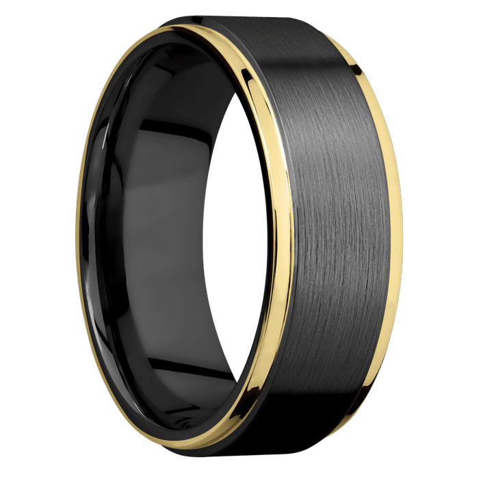 8mm wide Flat Grooved Edges Black Zirconium Ring with Satin Finish / Two 1mm Edge 14k Yellow Gold Inlay with Polish Finish