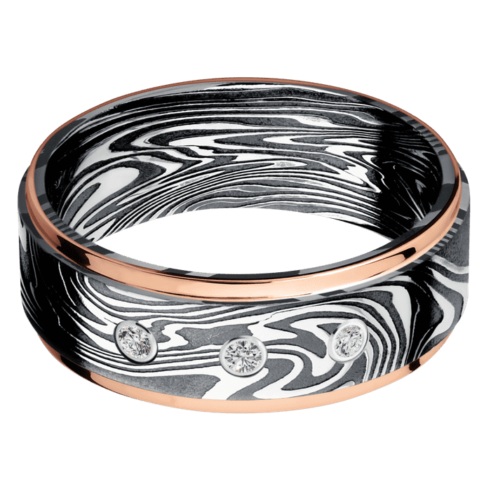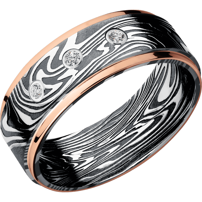 8mm wide Flat Grooved Edges Kinetic Damascus Steel Ring with Tumble Kuro Damascus Finish / Two 1mm Edge 14k Rose Gold Inlay with Polish Finish / 3 Round .03 carat Standard Diamond Bezel-Set Gemstones