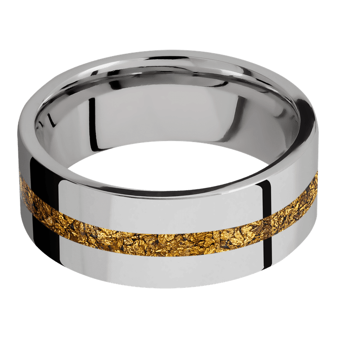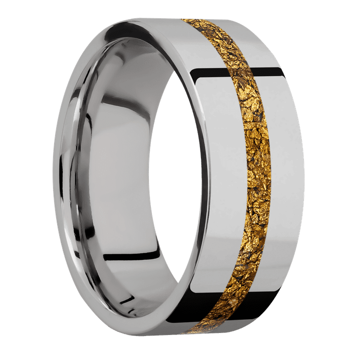 8mm wide Flat Titanium Ring with Polish Finish / One 2mm Centered 24k Raw Gold Nugget Inlay