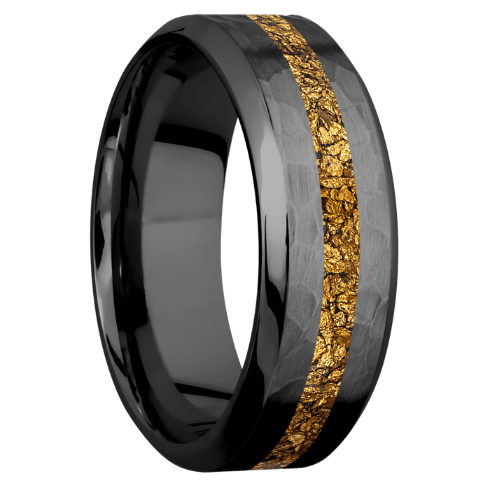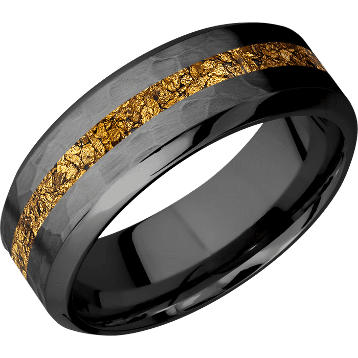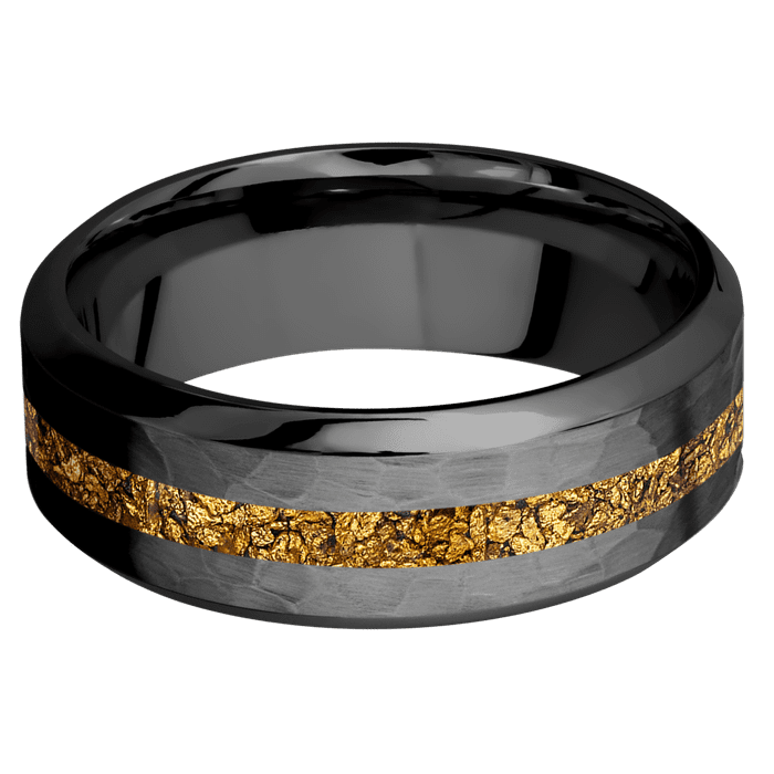 8mm wide High Bevel Black Titanium Ring with Hammer Finish / One 2mm Centered 24k Raw Gold Nugget Inlay