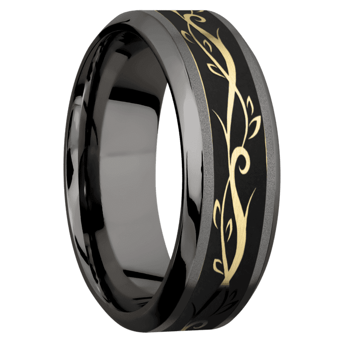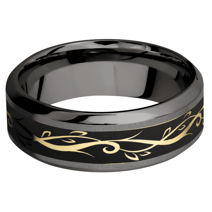8mm wide High Bevel Darkened Tantalum Ring with Sand Blast Finish / One 4mm Centered 14k Yellow Gold Inlay with Satin Finish / Vine Inlay Design