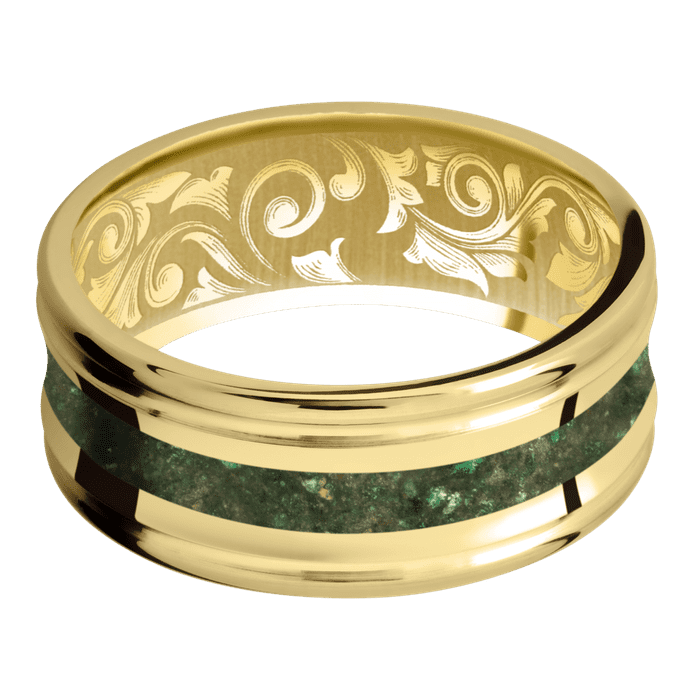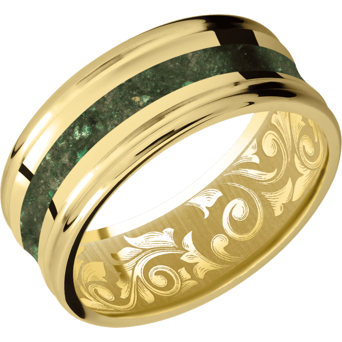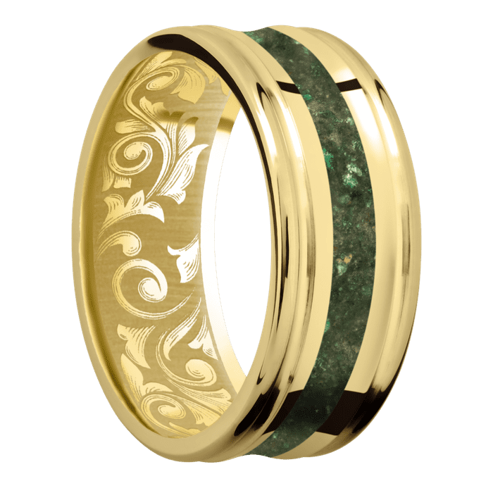 9mm wide Concave Center Round Edges 18k Yellow Gold Ring with Polish Finish / One 3mm Centered Green Fuschite Inlay / None Interior Pattern