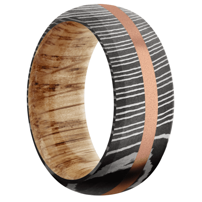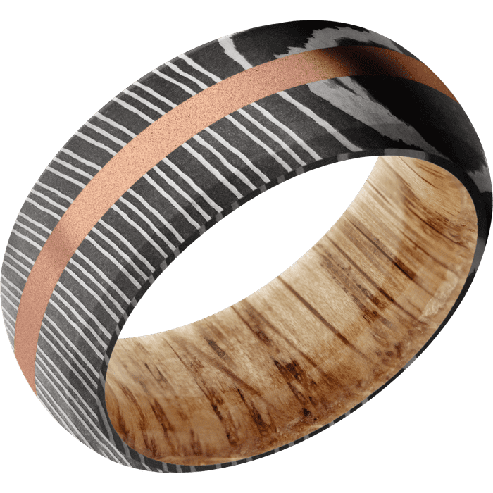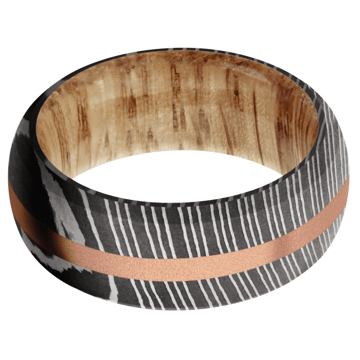 9mm wide Domed Bevel Damascus Steel Ring with Acid Damascus Finish / One 2mm Centered 14k Rose Gold Inlay with Sand Blast Finish / Natural Oak Sleeve