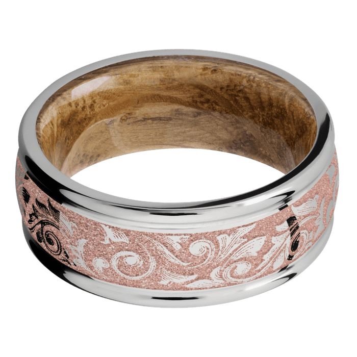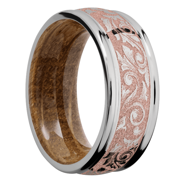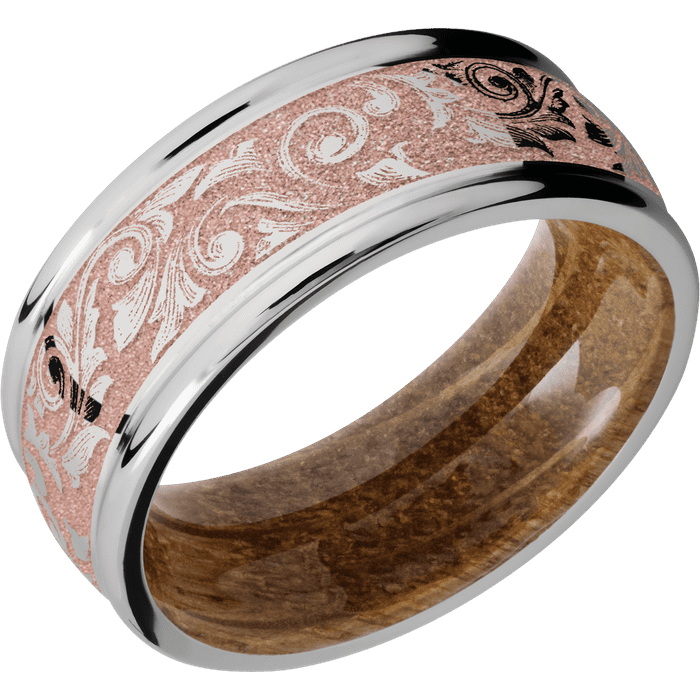 9mm wide Domed Rounded Edges Titanium Ring with Polish Finish / Western Scroll Design and Rose Gold Cerakote Accents / Whiskey Barrel Sleeve