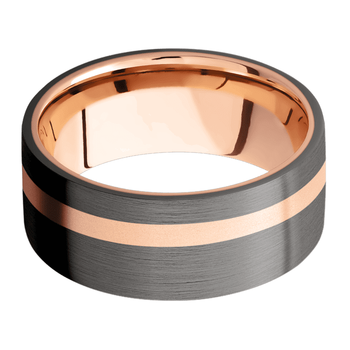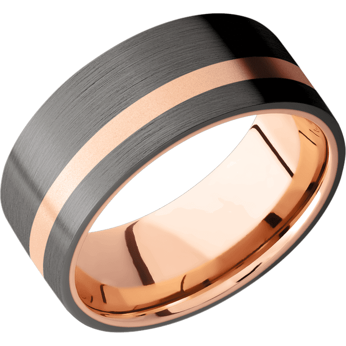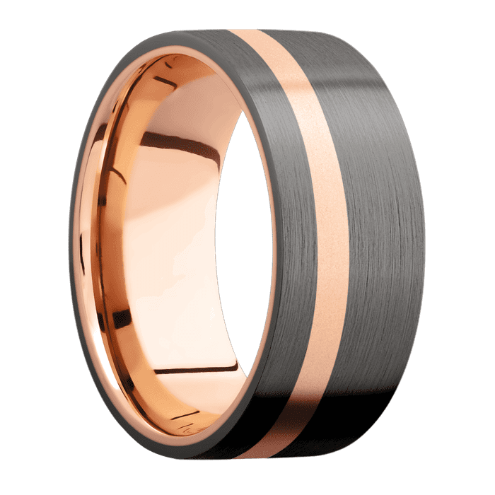 9mm wide Flat Darkened Tantalum Ring with Satin Finish / One 2mm Off Center 14k Rose Gold Inlay with Bead Blast Finish / 14k Rose Gold Sleeve