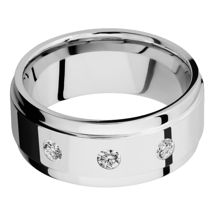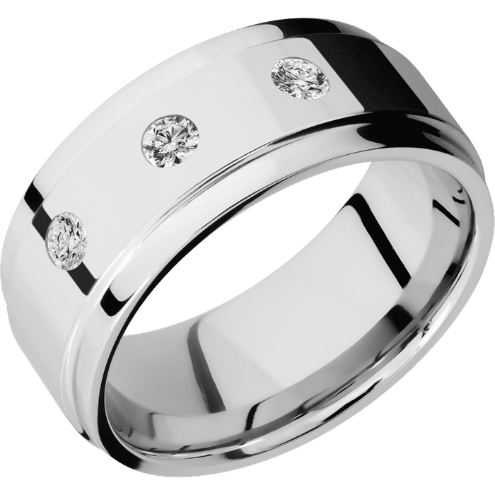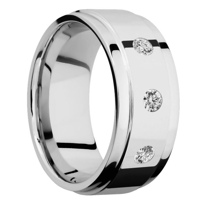 9mm wide Flat Wide Grooved Edges 14k White Gold Ring with Polish Finish / 3 Round .1 carat Standard Diamond Flush-Set Gemstones