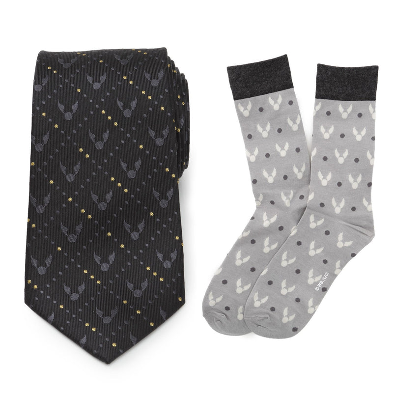 The ideal gift set for fans who know what the phrase "I open at the close" means, this Golden Snitch themed pairing elevates Harry Potter fandom to a whole other level. Delicate gold threads highlight simple Snitch icons on the 100% black silk necktie, and the gray and white socks are so comfortable they'll even wear them while playing in the Quidditch World Cup. Officially licensed by Warner Bros. Entertainment Inc.