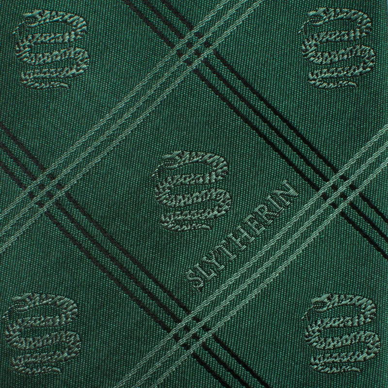 Share your love for the world of Harry Potter and represent House Slytherin with our Slytherin Plaid Tie. The Slytherin snake is woven into a window-plaid pattern in the iconic green of this Hogwarts house. Although many Dark Wizards came from this house, including Lord Voldemort, the characteristics of this house's members of being resourceful, ambitious, and cunning can also be very desirable traits. Our tie will maintain its shape and hold a perfect knot thanks to the durable yet soft 100% Silk. Officially licensed by Warner Bros. Entertainment Inc.