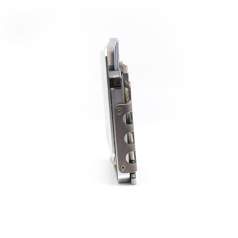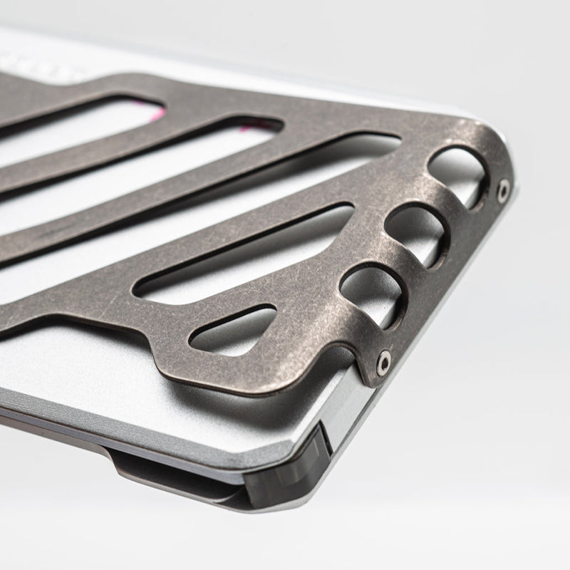 For those who demand even more from their carry, the SK1 is also available with an integrated titanium clip — a robust and lightweight addition that can securely hold up to 10 folded bills and additional cards or documents. Thoughtfully designed ventilation slots and precision-cut notches enhance both form and function: improving grip, reducing bulk, and allowing essential documents to be held tightly in place without compromise.